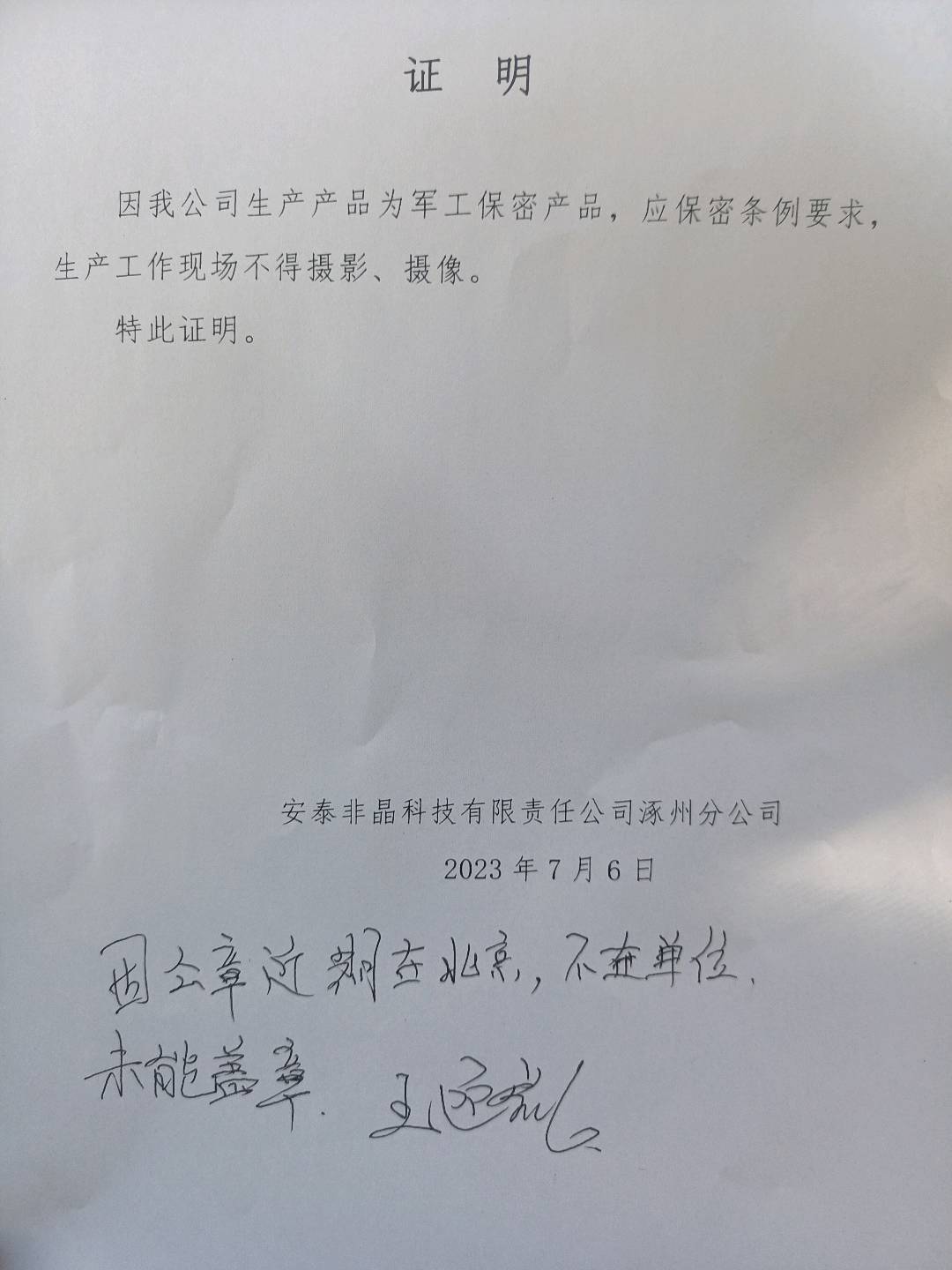 | 现场采样检测人员 | 杨靖、李贺涛 | 用人单位陪同人 | 孙天雄 | 时间 | 2023-07-13 |
