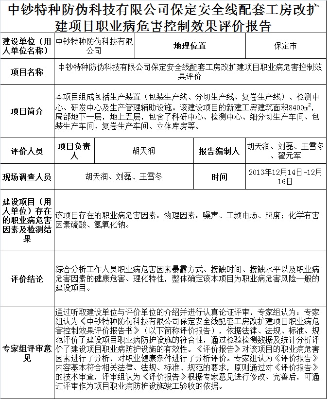 中钞特种防伪科技有限公司保定安全线配套工房改扩建项目职业病危害控制效果评价